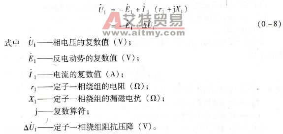 图0-6 定子侧的电动势平衡 (a)主磁通和漏磁通;(b)定子绕组的等效电路 2.等效电路 图0-6(b)所示为定子绕组的等效电路。它说明,当电源电压做功时,除了要克服反电动势外,还必须克服线圈的电阻和漏磁电抗。 3.电动势平衡方程 由等效电路可以得出,在稳定状态(电流的有效值不变)下,电动势的平衡方程如下