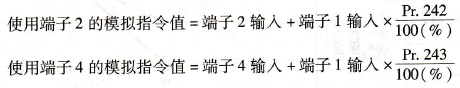 图2. 36 频率叠加功能的具体应用 5.比例补偿功能 在选择比例补偿时,端子1或4为主速度给定,端子2为比例补偿信号,这一点需要特别引起注意。在端子1或4主速度给定为0时,通过端子2的补偿也为0。比例补偿范围在参数Pr. 252(比例补偿偏置)和Pr. 253(比例补偿增益)中设定。 其中设定频率的计算公示如下。