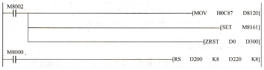 图5.35 网络运行模式 3.三菱PLC的设置 对通信格式D8120进行设置: D8120设置值为OC87,即数据长度为8位,偶校验停止位1位,波特率9 600pbs,无标题符和终结符。 修改D8120设置后,确保通断PLC电源一次。 4.通信程序 以VF0变频器为例,采用Modbus RTU协议,PLC与变频器通信部分PLC案例程序如下。