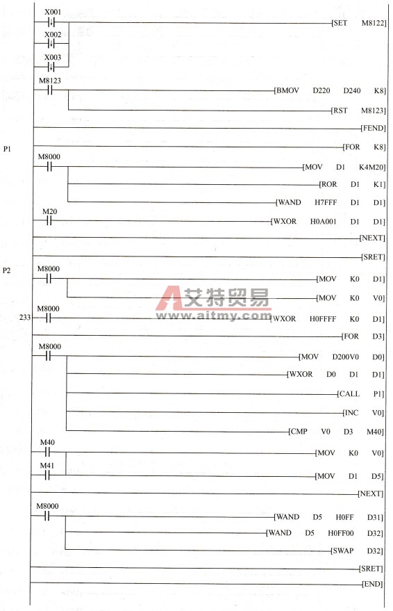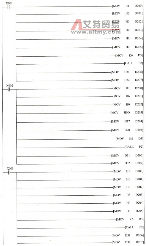 程序说明: (1)当X1接通一次后,变频器进入正转状态。 (2)当X2接通一次后,写入变频器运行频率60Hz。 (3)当X3接通一次后,变频器进入停止状态。 在指令中,变频器指令地址为0时,为广播指令,所有从站变频器只接收PLC发出的指令,不向主机发送响应信息。