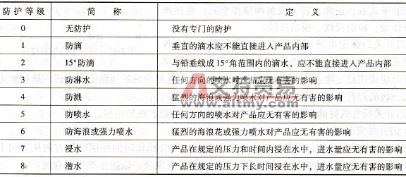 2)第二类防护型式:防止水进入内部达到有害程度的防护,第二类防护型式的分级及定义见表2-6。