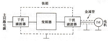 b.广播波的电场强度极弱时,在变频器的电源侧和电机侧接入干扰滤波器,同时将变频器的主回路电缆放入接地的金属管子中。金属管的接地线要尽量短,而且要完全接地,如图5-12所示。