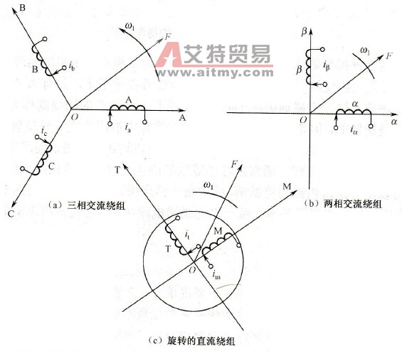异步电机的动态数学模型十分复杂,不要说求解,仅要求画出很清晰的结构也并非易事。如果能将交流电机的物理模型等效地变换成类似直流电机的模式,分析和控制问题就可以大为简化。坐标系变换正是按照这条思路进行的。在这里,不同电机模型彼此等效的原则是在不同的坐标下所产生的磁动势完全一致。