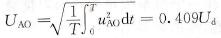 例如,在区间①中,S1、S6、S5导通,uAO→uCO→1/3Ud,uBO=2/3Ud;在区间②中,S1、S6、S2导通,uAO=2/3Ud,uBO=uCO=1/3Ud;在区间③中,S1、S3、S2导通,uAO→uBO→1/3Ud,uCO=2/3Ud;区间④~⑥与上面区间情况基本相同,只是电源极性相反,从而可画出相电压波形uAO、uBO、uCO为梯形波。线电压波形可按uAB=uAO-uBO,uBC=uBO-uCO,uCA=uCO-uAO求得,为一矩形波。从图2-22 (a)的波形图,可以容易地求出电压有效值。