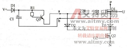 以U相输出电路为例:P、N为直流电源的正、负端;请注意a、b两点间的电压是如何产生的。无脉冲到来(静态)时,V+驱动电源因无通路,a、b两点间的电压为O,Q1截止,Q2截止;当激励脉冲到来时,Q2导通,U相输出负半波电压。因Q2的导通,将b点电压值由静态值拉低为N值,C1负端由静态电位瞬时跳变为N电位,故在C1的正极“感应来”与负极一样多的正电荷,或者换句话来说,Q2导通期间,V+经由Dl对C1进行了充电,C1的两个极板间积累了一定数量的电荷。因D2、D3的钳位作用,a、b两点是等电位的,故Q1不具备导通条件。在Q2的正脉冲过后,Q2截止,C1上电荷经Q、27R、Q1的栅、源极进行释放,实质上是提供了Q1的正向激励电压,使Q1得以导通,输出U相正半波电压。这样,驱动电源有机地和驱动脉冲配合,完成了对Q1、Q2的倒相输出控制。但C1是通过静电感应而“装入电荷”的,并不存在实际的直流通路。以上分析为个人见解,是否正确,还望方家指正。
