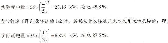 由流体力学可知,风机、泵类负载的实际消耗功率P(功率)=Q(流量)×H(压力),其中流量Q与电动机转速N的一次方成正比,压力H与转速N的平方成正比,由此可知,该类负载的实际消耗功率P与转速N的立方成正比。