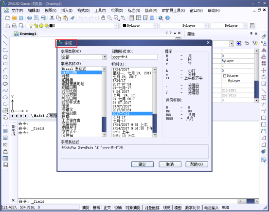 我们在CAD的使用中有些文字是需要跟随图纸的变化随之变化的,比如是我们的存储日期、打印日期、打印比例等等。中望CAD提供了字段的功能,这个功能定义了很多的动态的文字,我们使用时候就只要在我们的列表中选取即可。这样使用时更加的方便快捷。