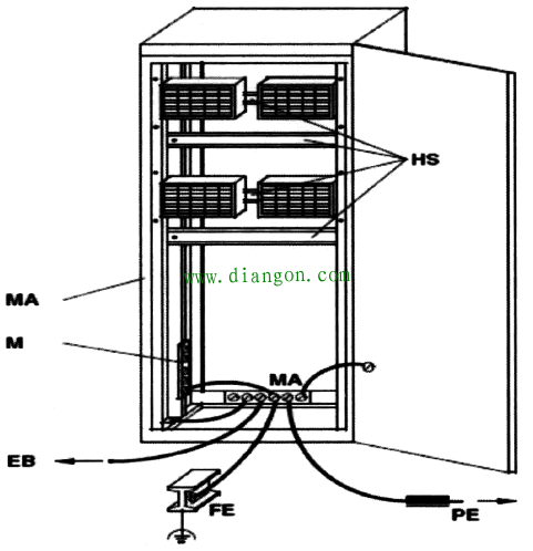 说明:EB为相邻的电柜或夹具;FE为功能地,比如供水管道、房间的中性地;HS为用来安装模块的底板或者安装附件的导轨;M为参考导体系统或者参考导体导轨(铜母线或端子板);MA为用作功能接地的接地(大地参考面板或者导轨);PE为保护地