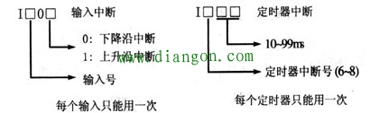 输入中断用来接收特定的输入地址号的输入信号,图1给出了输入中断和定时器中断指针编号的意义,输入中断指针为1�0�,最高位X0~X5的元件号相对应。最低位为0时表示下降沿中断,反之为上升沿中断。例如中断指针1001之后的中断程序在输入信号X0的上升沿时执行。同一个输入中断源只能使用上升沿中断或下降沿中断,例如不能同时使用中断指针1000和1001。