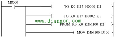 例1:设某系统的控制要求为:系统上电将模拟量输入1进行A/D转换,并且将转换结果读入到PLC的数据寄存器D100