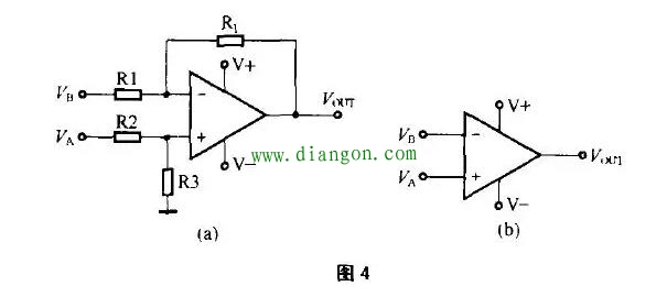 图4(a)由运算放大器组成的差分放大器电路,输入电压VA经分压器R2、R3分压后接在同相端,VB通过输入电阻R1接在反相端,RF为反馈电阻,若不考虑输入失调电压,则其输出电压Vout与VA、VB及4个电阻的关系式为:Vout=(1+RF/R1)·R3/(R2+R3)VA-(RF/R1)VB。若R1=R2,R3=RF,则Vout=RF/R1(VA-VB),RF/R1为放大器的增益。当R1=R2=0(相当于R1、R2短路),R3=RF=∞(相当于R3、RF开路)时,Vout=∞。增益成为无穷大,其电路图就形成图4(b)的样子,差分放大器处于开环状态,它就是比较器电路。实际上,运放处于开环状态时,其增益并非无穷大,而Vout输出是饱和电压,它小于正负电源电压,也不可能是无穷大。