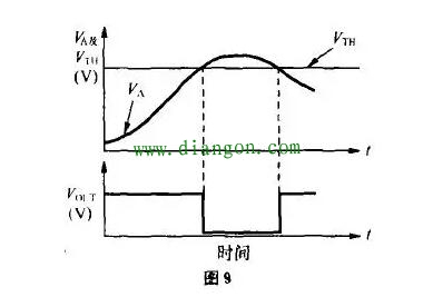 设计时希望散热片上的温度一旦超过80℃时接通散热风扇实现散热,则VTH的值应等于80℃时的K值。一旦VA>VTH,则比较器输出低电平,继电器K吸合,散热风扇(直流电机)得电工作,使大功率器件降温。VA、VTH电压变化及比较器输出电压Vout的特性如图9所示。这里要说清楚的是在VA开始大于VTH时,风扇工作,但散热体有较大的热量,要经过一定时问才能把温度降到80℃以下。