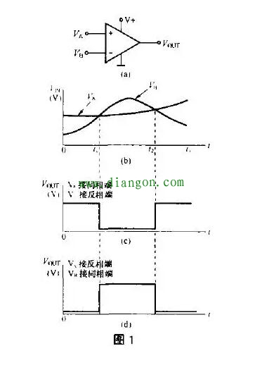 如果把VA输入到反相端,VB输入到同相端,VA及VB的电压变化仍然如图1(b)所示,则Vout输出如图1(d)所示。与图1(c)比较,其输出电平倒了一下。输出电平变化与VA、VB的输入端有关。