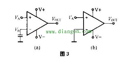 在这种情况下,Vout的输出如图1(c)所示:VA>VB时,Vout输出高电平(饱和输出);VB>VA时,Vout输出低电平。根据输出电平的高低便可知道哪个电压大。