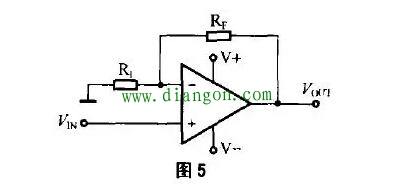 同相放大器电路如图5所示。如果图5中RF=∞,R1=0时,它就变成与图3(b)一样的比较器电路了。图5中的Vin相当于图3(b)中的VA。