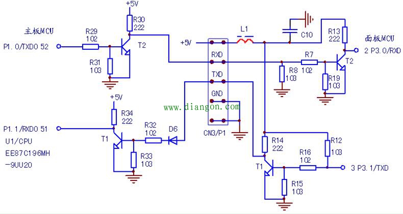 其二,起到阻抗变换作用。如图4串行脉冲传输电路,系主板MCU和面板MCU的通讯电路,输入和输出信号在幅度和极性上显然是一样的,但若直接传输,对外部干扰信号的抵抗力较差。串入否定之否定之电路,使传输线阻大为降低,有一定的电流在流通着,干扰信号便被“水流”冲走了。一定程度上提升了抗干扰能力。