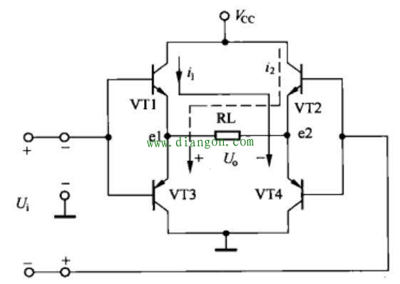 典型BTL功率放大器如下图所示。BTL功率放大器的功率放大管是由两个互补对称电路构成的四桥臂电路,负载RL接在两个互补对称电路的输出端,并且采用直接耦合输出方式。