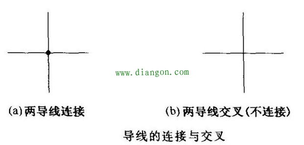 图a)所示横竖两导线交点处画有一圆点,表示两根导电连接在一起,图b)所示两根导线交点处无圆点,表示两根导线交叉而不连接。
