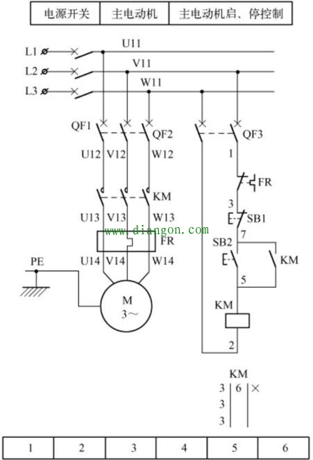 这个图是电动机的基本的连续运行电路图,图中的L1 L2 L3分别代表相线的A B C三相电,QF1 QF2分别是总电源空气开关和电动机的保护空气开关,QF3是控制线路的空气开关,空气具有切断线路的正常电流、过电流和短路电流的能力,具有自动保护功能,有小型空气开关俗称:空开和总制型空气开关俗称:断路器;FR是保护电动机过载的热继电器;KM是电动机启动用的交流接触器,它具有欠、失压保护功能,触头能够切断正常电流和短路电流的能力,和空气开关一样都有灭弧装置,主要是接通电源线路功作用。