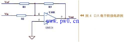 由图可知,D/A电平转换原理是在运放输入端采用加法电路,将输入信号与基准电平比例相加,得到适合采样的电压范围。