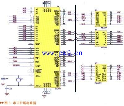 由图1可知,该飞行控制器需要与GPS、磁航向计和无线电高度表等进行通讯,共需5个串口。而586-Engine主板只提供2个串口,分别供地面检测和测控电台使用,因此需要进行串口扩展。串口扩展电路如图3所示。