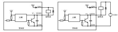 简介变频器多功能输出端子接线方式 1、开路集电极Y1、Y2的接线: a)使用内部电源 b)使用外部电源 备注:A、上拉电阻的选择:需要根据电源容量来选择,我们内部+24V的电源容量为200mA,
