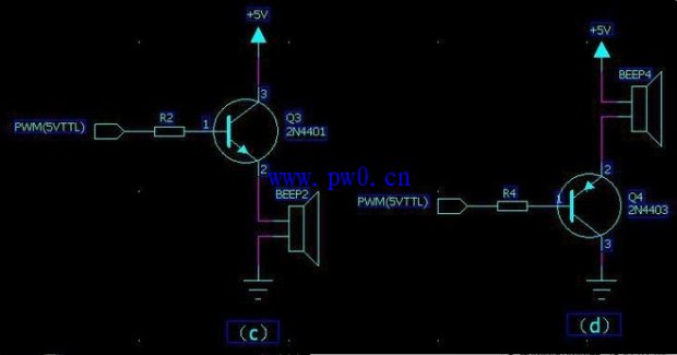 图一的a 电路用的是NPN管,注意蜂鸣器接在三极管的集电极,驱动信号可以是常见的3.3V或者5VTTL,高电平开通,电阻按照经验法可以取4.7K。例如a电路,开通时假设为高电平5V,基极电流Ib=(5V-0.7V)/4.7K=0.9mA,可以使三极管完全饱和。b 电路用的是PNP管,同样把蜂鸣器接在三极管的集电极,不同的是驱动信号是5V的TTL电平。以上这两个都可以正常工作,只要PWM驱动信号工作在合适的频率,蜂鸣器(有源)都会发出最大的声音。
