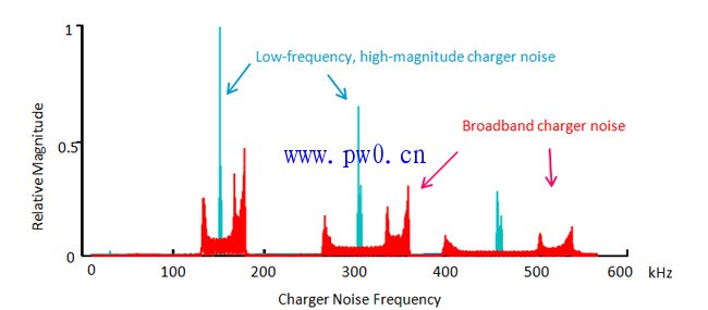 干扰包括宽带与窄带噪声,通常振幅较高。我们看到,共模干扰的频率最高可达500kHz,振幅可达40Vpp。见图2