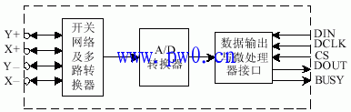 触摸屏控制器有多种,主要的功能均是在微处理器的控制下向触摸屏的两个方向分时施加电压,并将相应的电压信号传送给自身A/D转换器,在微处理器SPI口提供的同步时钟作用下将数字信号读入微处理器。控制器ADS7846基本结构如图2所示。