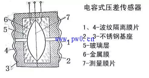 罗斯蒙特公司使用金属电容传感器制成了1151差压变送器,现在国内很多厂家的差压变送器都是参考1151制造的。金属电容差压传感器的原理是:被测介质的两种压力通入高、低两压力室,作用在敏感元件的两侧隔离膜片上,通过隔离片和元件内的填充的硅油传送到测量膜片两侧。由测量膜片与两侧绝缘片上的电极各组成一个电容器。当两侧压力不一致时,致使测量膜片产生位移,其位移量和压力差成正比,故两侧电容量就不等,通过振荡和解调环节,转换成与压力成正比的信号。这个信号可以是电压,或者频率及脉冲。
