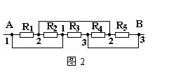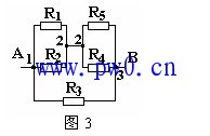 解析:按从A到B的顺序把5个电阻分成R1、R2、R3、R4、R5,其节点标示如图2所示。由于节点R2、R3间和A点是用导线相连,这两点是等势点,故两节点可用同一个数字1标出,当电流从A点流入时可以同时流向电阻R1、R2、R3,从电阻R1和电阻R2流出的电流汇合于2点,到达R4和R5间的节点,故R4和R5间的节点也用2标出,R3、R4间的节点和B点间是导线相连,也是等势点,故均用3标出,电流再从电阻R4和电阻R5经节点3流出,而流向电阻R3的电流则直接经节点3流出,简化后其等效电路如图3所示。