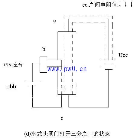 ④ 如图 2.20 ( d )所示:当对发射结施加电压在 0.9V 时,相当于闸门已打开三分之二的状态时,水龙头底部已经可以有三分之二的水通过水嘴流出来了,此时, ec 之间的电阻值也下降了三分之二, ec 之间的电流处于调控或者说是放大状态。