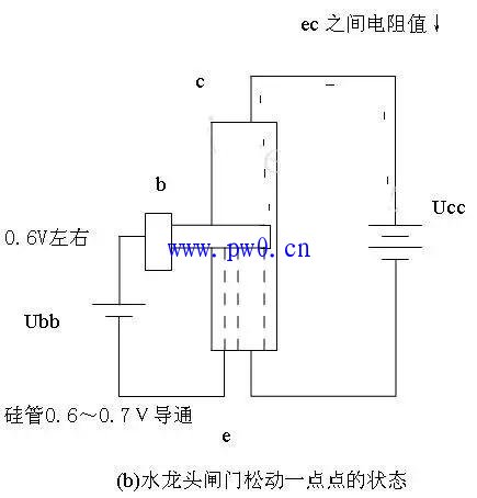 ② 如图 2.20 ( b )所示:当对发射结施加电压在门限电压范围时(以硅管 0.7V 左右为例),相当于闸门松动一点点,从水龙头底部通过水嘴流出的水成滴答状态。此时, ec 之间的电阻值也下降了一点点。