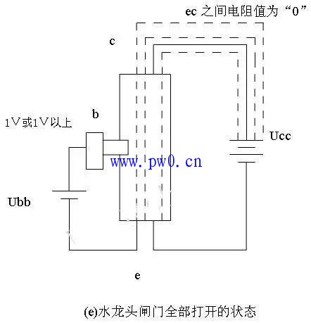 ⑤ 如图 2.20 ( e )所示:当对发射结施加电压在 1V 或者 1V 以上时,相当于闸门已完全打开的状态时,水龙头底部所有的水已经可以通过水嘴流出来了,此时, ec 之间的电阻值也下降为“ 0 ”,或者说很小,可以或略不计, ec 之间的电流处于饱和状态,或者说是开关的 ON 状态。