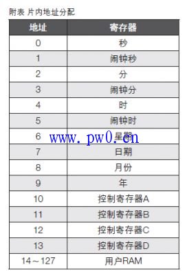 看完了外面,进到里面看看。DS12887内部有10字节的时钟(时、分、秒)、闹钟(时、分、秒)和日历(年、月、日、星期)寄存器和4个控制寄存器以及114字节的通用RAM。地址分配如附表所示。在本文的设计中只使用了前面14字节的时钟、闹钟、日历和控制寄存器,其余的114字节的RAM并未使用。采用了图3所示的电路图后,片内的14字节的地址分配就是从0x0000~0x000D,在程序中可以像访问外部RAM一样方便地读取和写入数据至这些地址。0x0000~0x0009是时钟、闹钟和日历寄存器,保留了时间信息等相关内容,单片机可以通过读取这些内容将时间信息显示出来。寄存器A的BIT6~BIT5控制DS12887内部晶体振荡器的关断。寄存器B控制各种中断的使能,在本文中需要将闹钟使能位(BIT5)打开,BIT2决定输出的时钟数据是十六进制或是BCD码,BIT1决定时间采用的格式:24小时或12小时制。寄存器C保存了中断标志位,若在使用多种中断的情况下,微控制器可以通过读取该寄存器辨别是产生了何种中断,从而进入相应的处理程序。而在本设计中,只使用了闹钟中断,当在/IRQ引脚输出低电平时,就可以判断产生了闹钟时间到的中断。但是仍需要通过读取该寄存器以清楚中断标志,以免程序重复处理。寄存器D是与器件是否有效相关的寄存器,本电路无需处理该寄存器。