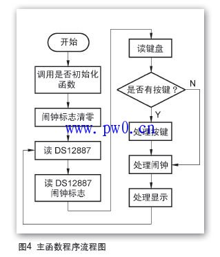 笔者使用的编译环境为Keil编译软件,采用C51编程语言。整个程序由几个模块构成,文件mmi.c中包括一些人机交互处理的函数,比如读取按键、在数码管上显示时间信息、LED和蜂鸣器的发声处理等;文件ds12887.c中包括读写和初始化DS12887的函数;文件my52.c中包含延时函数;在文件main.c中则调用这些模块中的函数进行综合处理,主函数的程序流程图如图4所示。各个xxx.h文件中则是相应的xxx.c文件中的函数声明、全局变量声明等.