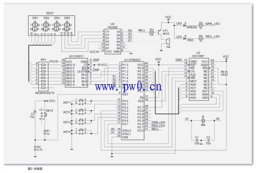 74LS06包含6个非门电路,本文只需要其中4路即可。在输入端置"1",对应的输出端则为"0",则选中其中一个数码管。比如在AT89S52的P1.4输入"1",则74LS06的4A引脚为"1",在其对应的输出脚4Y输出就为"0",从而选中与s1相连的DS1数码管。在焊接电路板时,可以将CD4511和74LS06这两个芯片放在数码管下方,这样整个电路板就会小巧一些。因为数码管只有4位,而且必须用其中的两位显示一项时间信息,所以每次只可以显示两项时间信息,例如DS1、DS2分别显示月份的十位、个位,DS3、DS4分别显示日期的十位、个位。但要显示的时间信息要多得多,所以采用"分时复用"的方法轮流显示时和分、月和日、年和星期,在时间分配上笔者使用了下述方案:在每一分钟中,0~9s、20~39s、50~59s的时间里显示时钟的时和分,在10~19s内显示月和日,在40~49s内显示年和星期,而时钟的秒数则不作显示处理。因为星期的最大数值为7(表示星期天),可以只在个位显示,星期分配的十位可以作"消隐"处理。设定的闹钟信息不是需要经常查看的,所以不做上述的分时显示,而是通过按下KEY4键查看。电路图中的4个按键功能分配如下,KEY1:数值加1键;KEY2:数值减1键;KEY3:调节项目选择,当该键按下可以选择不同的调节项目,依次为时钟的时、时钟的分、月份、日期、年、星期、闹钟的时和闹钟的分。KEY4:选择显示时间(包括时、分、月、日、年和星期)或闹钟。红色的LED闪亮表示数码管当前显示的是闹钟的时和分,绿色的LED闪亮表示当前显示的是时钟的时和分;而红色的LED闪亮和蜂鸣器发出声音,则表示闹钟所定格的时间到来,发出警报提醒;当两个LED都不闪亮时表示显示的为日历信息,即月、日、年和星期,可以通过DS3是否显示数据区分出显示的是月、日还是年、星期。