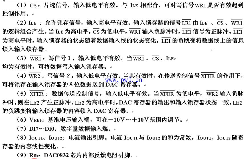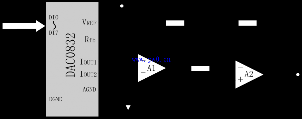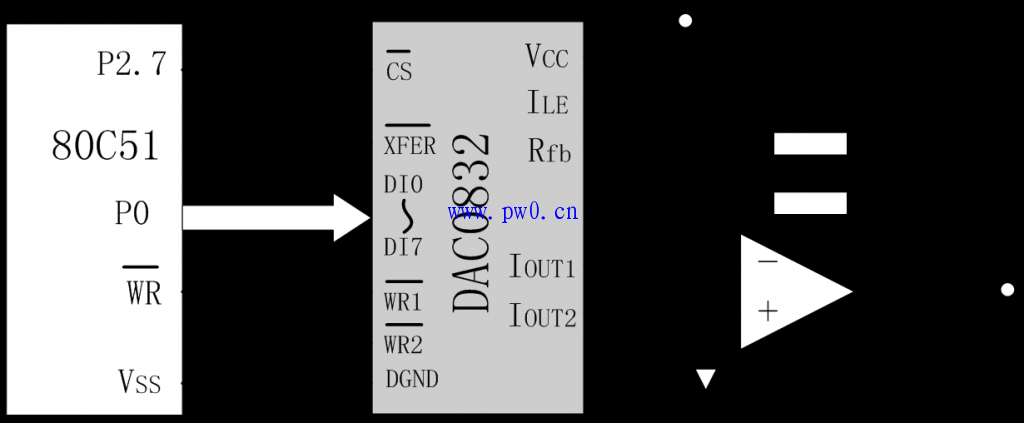 DAC0832是使用非常普遍的8位D/A转换器,由于其片内有输入数据寄存器,故可以直接与单片机接口。DAC0832以电流形式输出,当需要转换为电压输出时,可外接运算放大器。属于该系列的芯片还有DAC0830、DAC0831,它们可以相互代换。DAC0832主要特性: