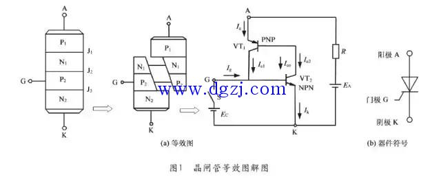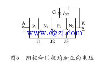 在门极G上加入正向电压时(如图5所示),因J3正偏,P2区的空穴进入N2区,N2区的电子进入P2区,形成触发电流IGT。在晶闸管的内部正反馈作用(如图2)的基础上,加上IGT的作用,使晶闸管提前导通,导致图2中的伏安特性OA段左移,IGT越大,特性左移越快。