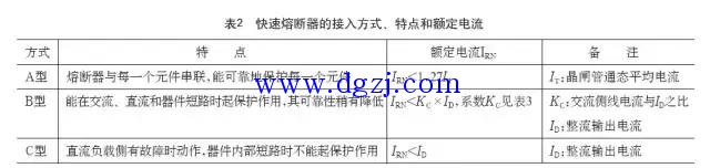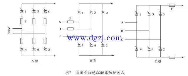 ①对于第一类过流,即整流桥内部原因引起的过流,以及逆变器负载回路接地时,可以采用第一种保护措施,最常见的就是接入快速熔断器的方式,如图7所示(F)。快速熔断器的接入方式共有三种,其特点和快速熔断器的额定电流见表2。