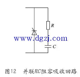 ②电压上升率du/dt的抑制。加在晶闸管上的正向电压上升率du/dt也应有所限制,如果du/dt过大,由于晶闸管结电容的存在而产生较大的位移电流,该电流可以实际上起到触发电流的作用,使晶闸管正向阻断能力下降,严重时会引起晶闸管误导通。为抑制du/dt的作用,可以在晶闸管两端并联R-C阻容吸收回路,如图12所示。