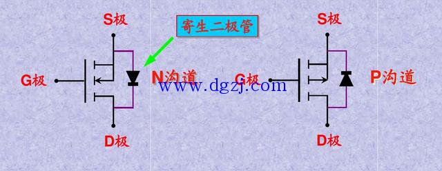 寄生二极管的方向与沟道箭头方向一致的是“N沟道MOSFET”,如下图。