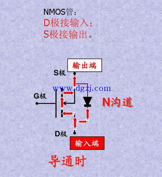 MOS管的输入输出方向是与寄生二极管的方向相反。如NMOS管,下图所示。
