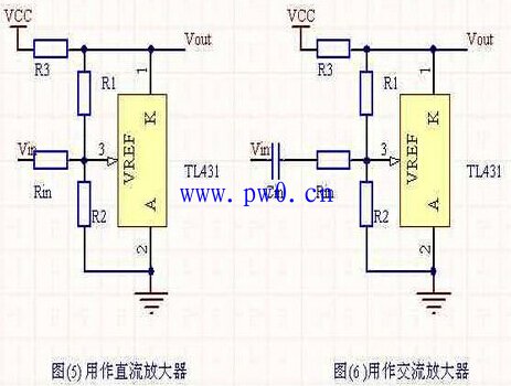 图(5)显示了一个用TL431组成的直流电压放大器,这个电路的放大倍数由R1和Rin决定,相当于运放的负反馈回路,而其静态输出电压由R1和R2决定。 这个电路的优点在于,它结构简单,精度也不错,能够提供稳定的静态特性。缺点是输入阻抗较小,Vout的摆幅有限。