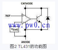 左图是该器件的符号。3个引脚分别为:阴极(CATHODE)、阳极(ANODE)和参考端(REF)。TL431的具体功能可以用如图2的功能模块示意。