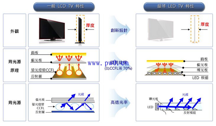 使用LED液晶屏背光可降低电视机的厚度、体积、重量,侧照式LED液晶屏(edge LED)可达1cm以下。