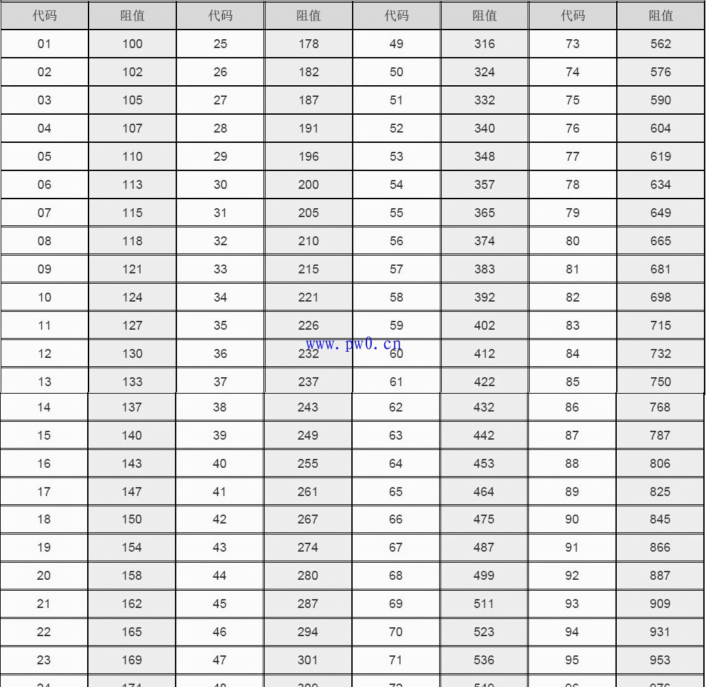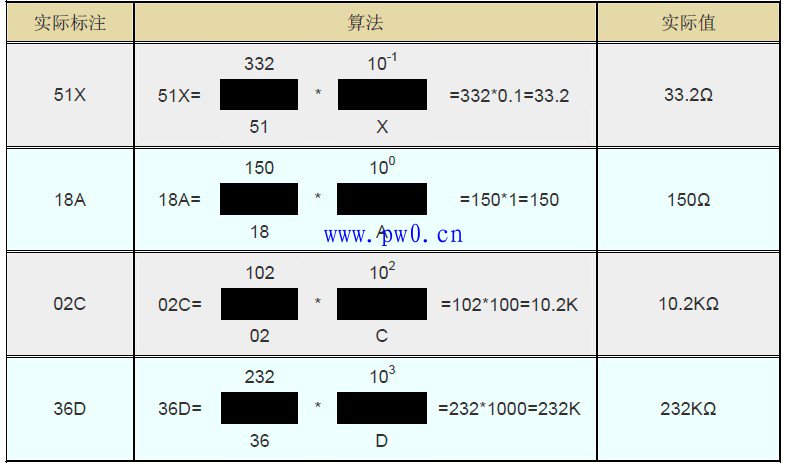 xxxy=xxx*10y前两位XX 指有效数的代码,具体值从E-96 乘数代码表查找,转换为xxx; 后一位Y 指10 的几次幂的代码,具体指从E-96 阻值代码表 查找,转换为y。