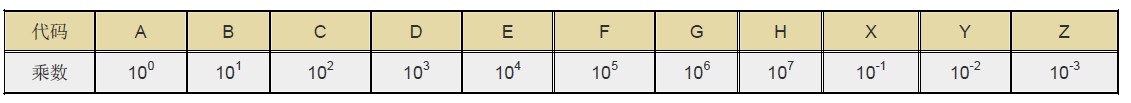 XXXY=XXX*10Y前三位XXX 代表3 位有效数,后1 位Y 代表10 的几次幂。