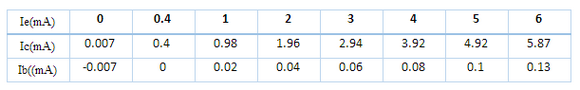 改变电路中集电极Rb的数值而使基极电流Ib发生变化,便可相应的测出集电极电流Ic及发射极电流Ie的大小。下表为从三个电流表中读出的8组Ib、Ic、Ie的数值。