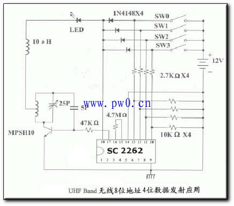 编码芯片PT2262发出的编码信号由:地址码、数据码、同步码组成一个完整的码字,解码芯片PT2272接收到信号后,其地址码经过两次比较核对后,VT脚才输出高电平,与此同时相应的数据脚也输出高电平,如果发送端一直按住按键,编码芯片也会连续发射。当发射机没有按键按下时,PT2262不接通电源,其17脚为低电平,所以315MHz的高频发射电路不工作,当有按键按下时,PT2262得电工作,其第17脚输出经调制的串行数据信号,当17脚为高电平期间315MHz的高频发射电路起振并发射等幅高频信号,当17脚为低平期间315MHz的高频发射电路停止振荡,所以高频发射电路完全收控于PT2262的17脚输出的数字信号,从而对高频电路完成幅度键控(ASK调制)相当于调制度为100%的调幅。